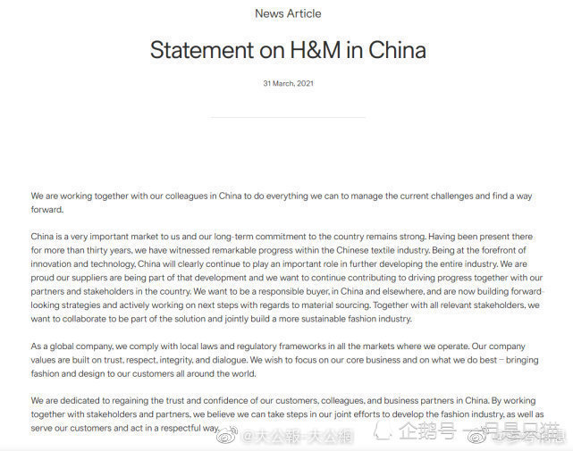 Hm发全英文声明 我就是想赚中国人的钱但我又不想道歉 现已亏损十亿 新疆棉花